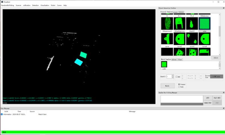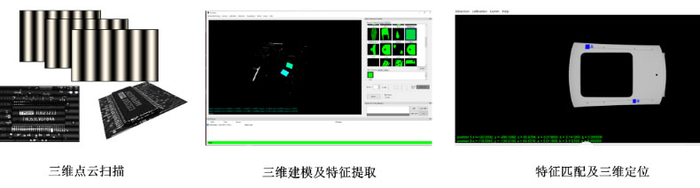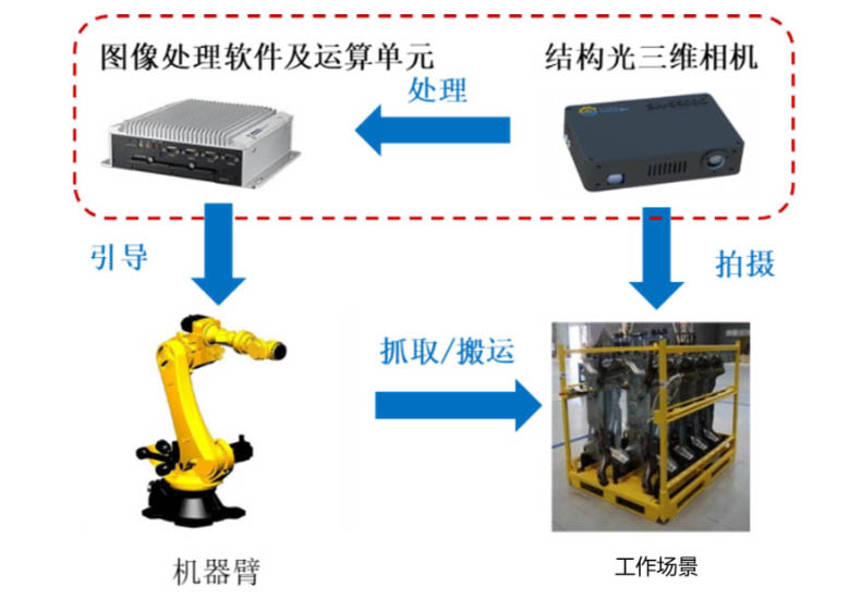 三維物體識別、定位及機器人引導視覺系統主要由高精度三維圖像傳感器和智能三維圖像處理及機器人引導軟件組成。通過3D結構光掃描,快速獲取工作場景的三維圖像信息,并通過與圖像庫中的模型進行對比,自動識別工作場景中的零件類型,及其三維空間內的位置及姿態信息,從而實時引導機器人調整位置及姿態,準確完成相應工作。