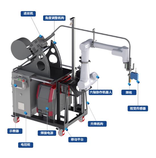 智能移動焊接平臺專為工業焊接場景設計,可為客戶提供快速布局的協作機器人焊接平臺。本平臺采用協作機器人作為運動機構,通過拖拽方式示教,降低了人工示教難度,并通過視覺引導技術,工件夾持和示教過程均無需精確定位,由視覺自動掃描完成焊縫起點、終點和焊縫軌跡的精確找尋。本平臺采用一體化設計,包含焊接電源和綜合控制柜,可以實現靈活移動和快速布局。適合小批量、多種類零件焊接,及大型鋼結構零件焊接。