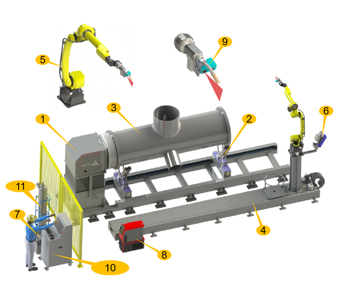 6、自動清槍站;7、機器人控制柜;8、焊機;9、視覺系統;10、操控臺;11、氣罐瓶