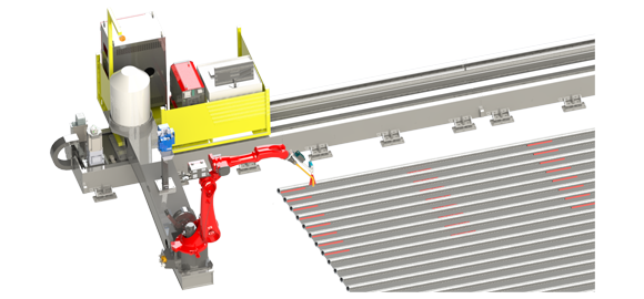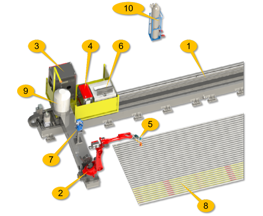 1、行走軸地軌;2、焊接機(jī)器人;3、機(jī)器人控制柜;4、焊機(jī);5、視覺(jué)系統(tǒng);6、操控臺(tái);7、自動(dòng)清槍站;8、管屏焊件;9、送絲桶;10、氣罐瓶。
